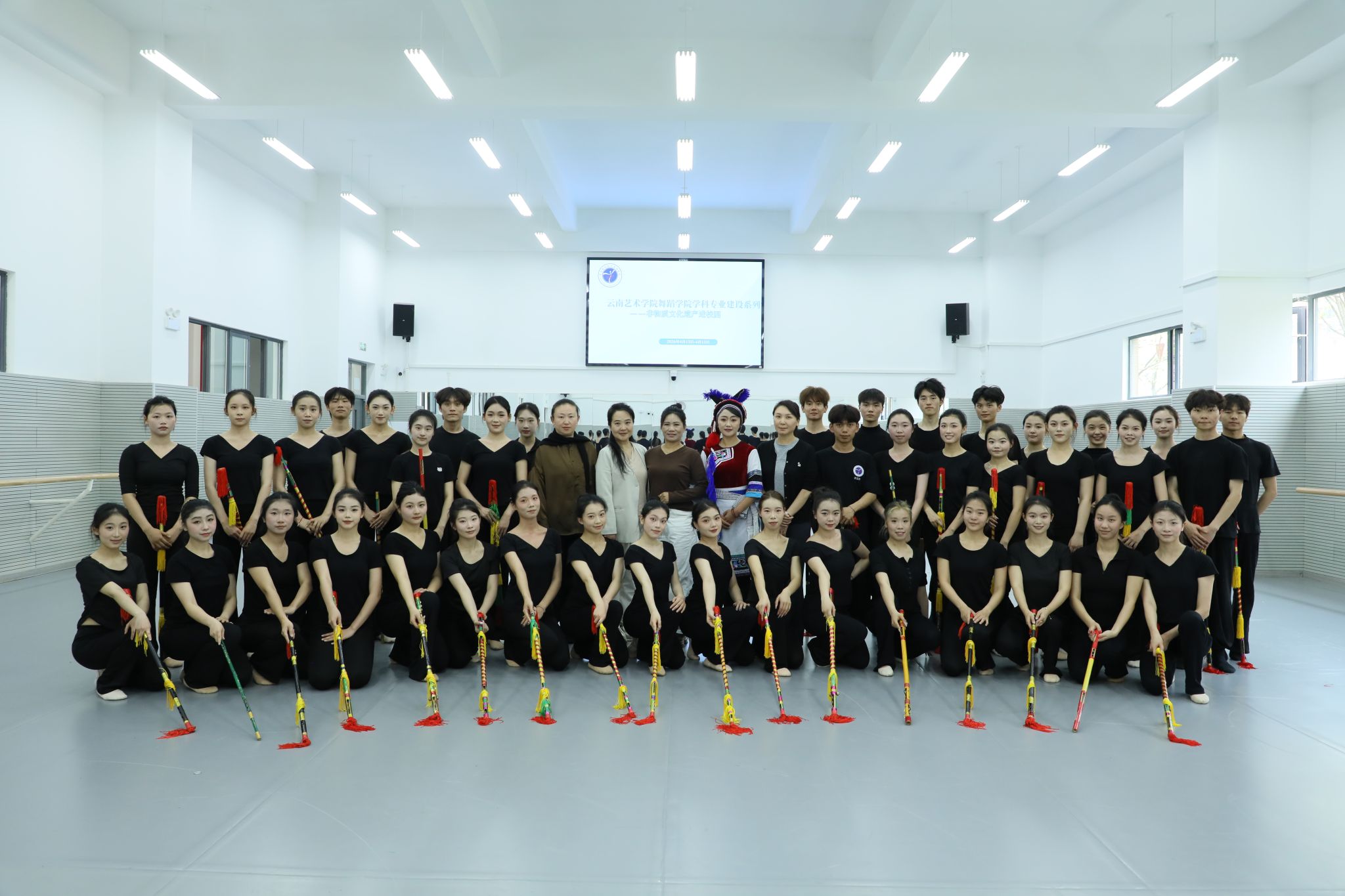 为推动非物质文化遗产保护传承工作,弘扬优秀民族传统舞蹈艺术,舞蹈学院于2026年4月13日开展了学科专业建设系列活动暨“非物质文化遗产课堂传承”课程。本次课程特邀洱源霸王鞭州级代表性传承人李六妹老师与剑川县文化馆工作者李四代老师授课。此次教学面向舞蹈学院2023级、2024级、2025级民族舞蹈传承方向全体本科生。李六妹、李四代两位老师针对白族霸王鞭的击打节奏、肢体动律以及传统套路演绎进行了系统而细致的示范教学。不仅传授了精湛的技艺,...
