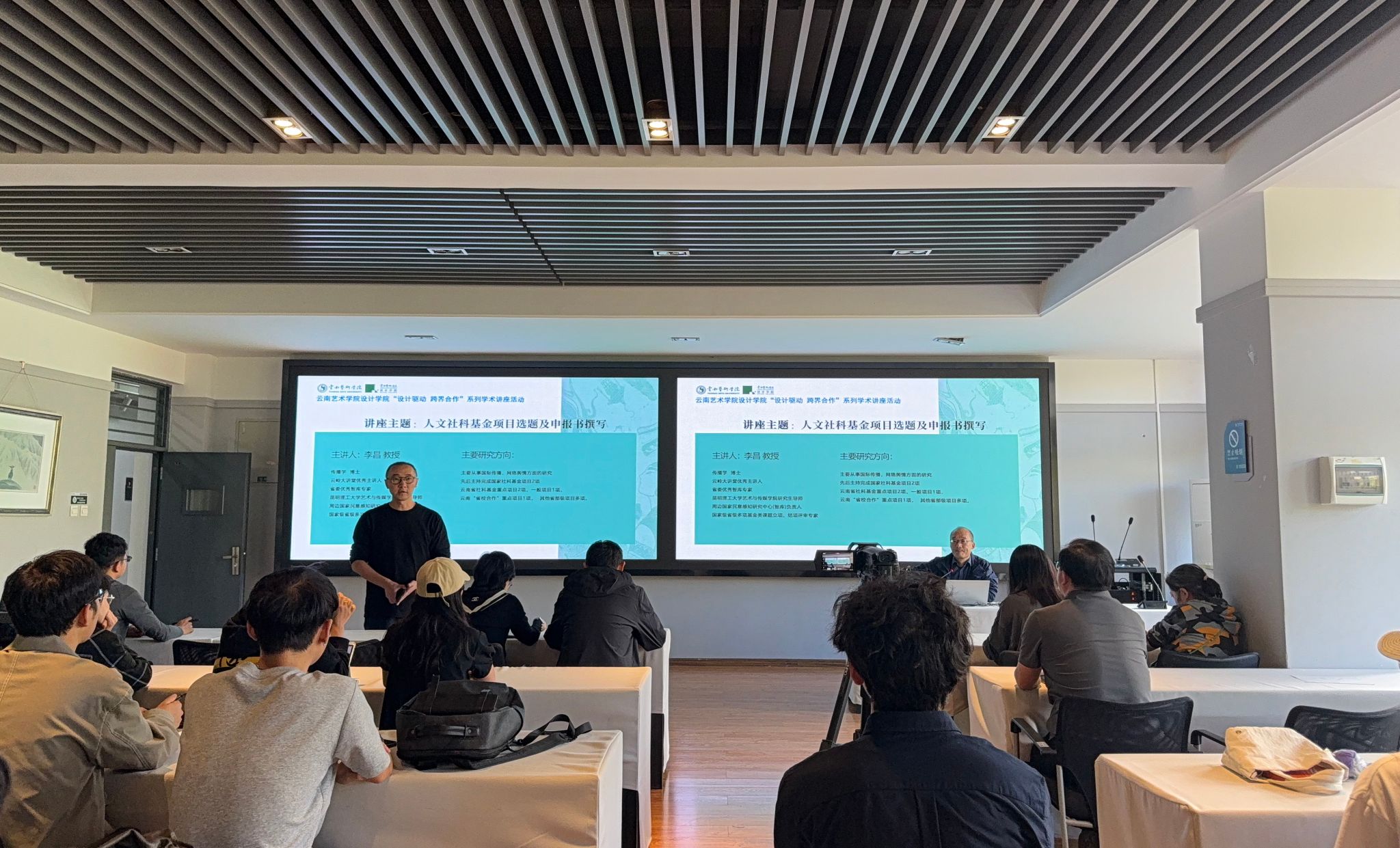 2025年10月9日,按照“设计驱动 跨界融合”系列学术讲座安排,结合设计学院“一站式”学生社区建设,一场以《人文社科基金项目选题及申报书撰写》为主题的讲座在设计学院202教室成功举办。讲座邀请传播学博士,云岭大讲堂优秀主讲人、省委优秀智库专家、昆明理工大学艺术与传媒学院研究生导师、周边国家民意感知研究中心(智库)负责人李昌教授担任主讲。设计学院副院长邹洲教授主持,学院150余名中青年教师及研究生参加。