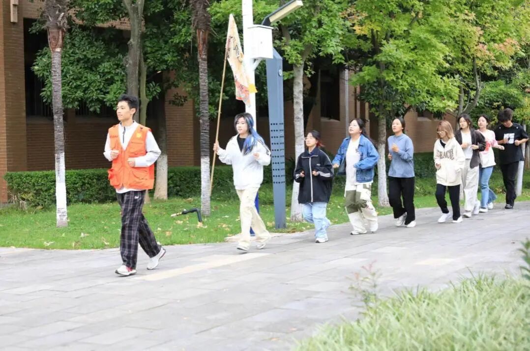 上午7:30,全体工作人员和招新成员在设计学院前广场集合,活动教练带领同学们进行热身拉练,强调本次素质拓展的纪律和安全。热身结束后参加活动的七支队伍分别展示并讲解团队队旗。活动设置了“直面自我”“牵手过河”“生死电网”“俯地起身”“齐眉棍”“盲人方阵”“东成西就”“孤岛求生”等游戏项目。