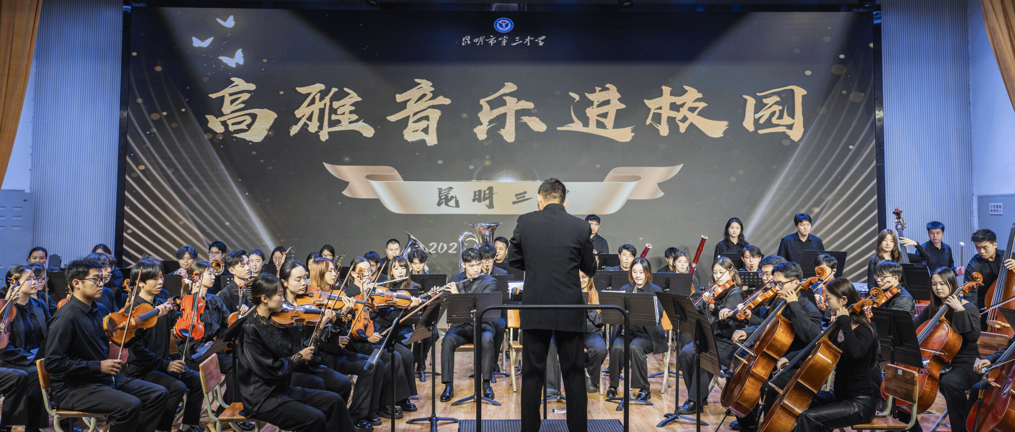 2025年11月11日19:00,昆三中图书馆报告厅座无虚席。云南艺术学院音乐学院教工第二党支部书记、云南艺术学院青年交响乐团指挥杨凯带领乐团师生,为昆三中千余名师生呈现了一场震撼心灵的交响盛宴。作为双方党组织共建的年度重点项目,本场音乐会具有三大特色: