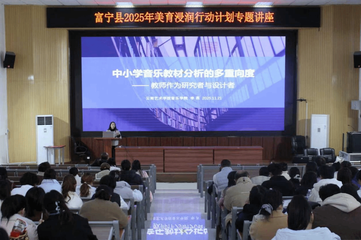 为深入贯彻落实美育浸润行动计划,推动 AI 时代中小学美育高质量发展,11 月 21 日上午,云南艺术学院音乐学院2025 年秋季学期美育浸润计划专题讲座在富宁县民族中学报告厅举行。全县中小学音乐教师齐聚一堂,共赴这场兼具理论深度与实践价值的美育盛宴。