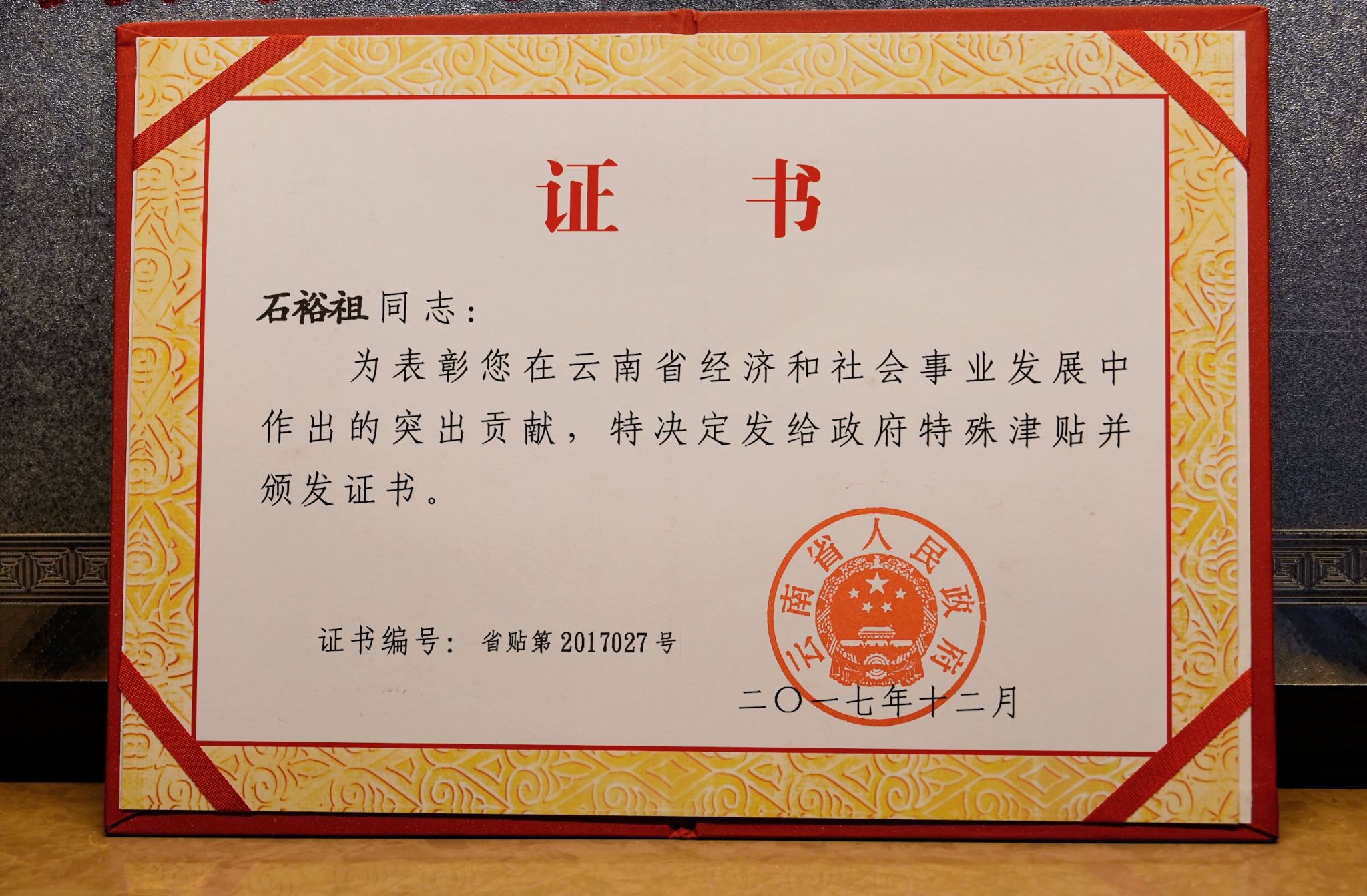 2017年12月,获评云南省人民政府特殊津贴专家。