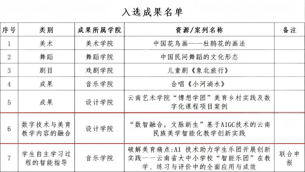 经评审,我校共有7项成果成功入选,涵盖艺术技能资源、艺术活动资源及智能化美育应用三大类别。设计学院有2项成果入选。分别为:艺术活动资源类1项《云南艺术学院“博想学团”美育乡村实践及数字化课程项目案例》;智能化美育应用案例类1项《“数智融合,文脉新生”——基于AIGC技术的云南民族美学智能化教学创新实践》(数字技术与美育教学内容融合方向)。此次入选的案例成果将陆续上线数字化美育资源库至国家中小学智慧教育平台美育频道,面向全国师生开放共享。