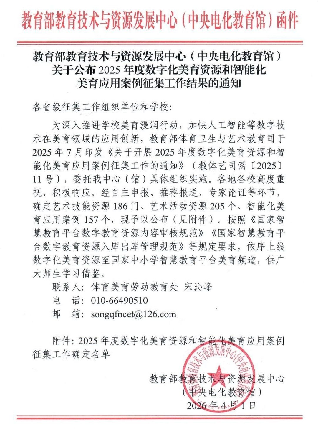 为深入推进学校美育浸润行动,加快人工智能等数字技术在美育领域的应用创新,教育部体育卫生与艺术教育司于2025年7月印发《关于开展2025年度数字化美育资源与智能化美育应用案例征集工作的通知》,委托教育部技术与资源发展中心(中央电化教育馆)面向全国征集相关案例。近日,教育部公布了2025年度数字化美育资源和智能化美育应用案例入选名单。