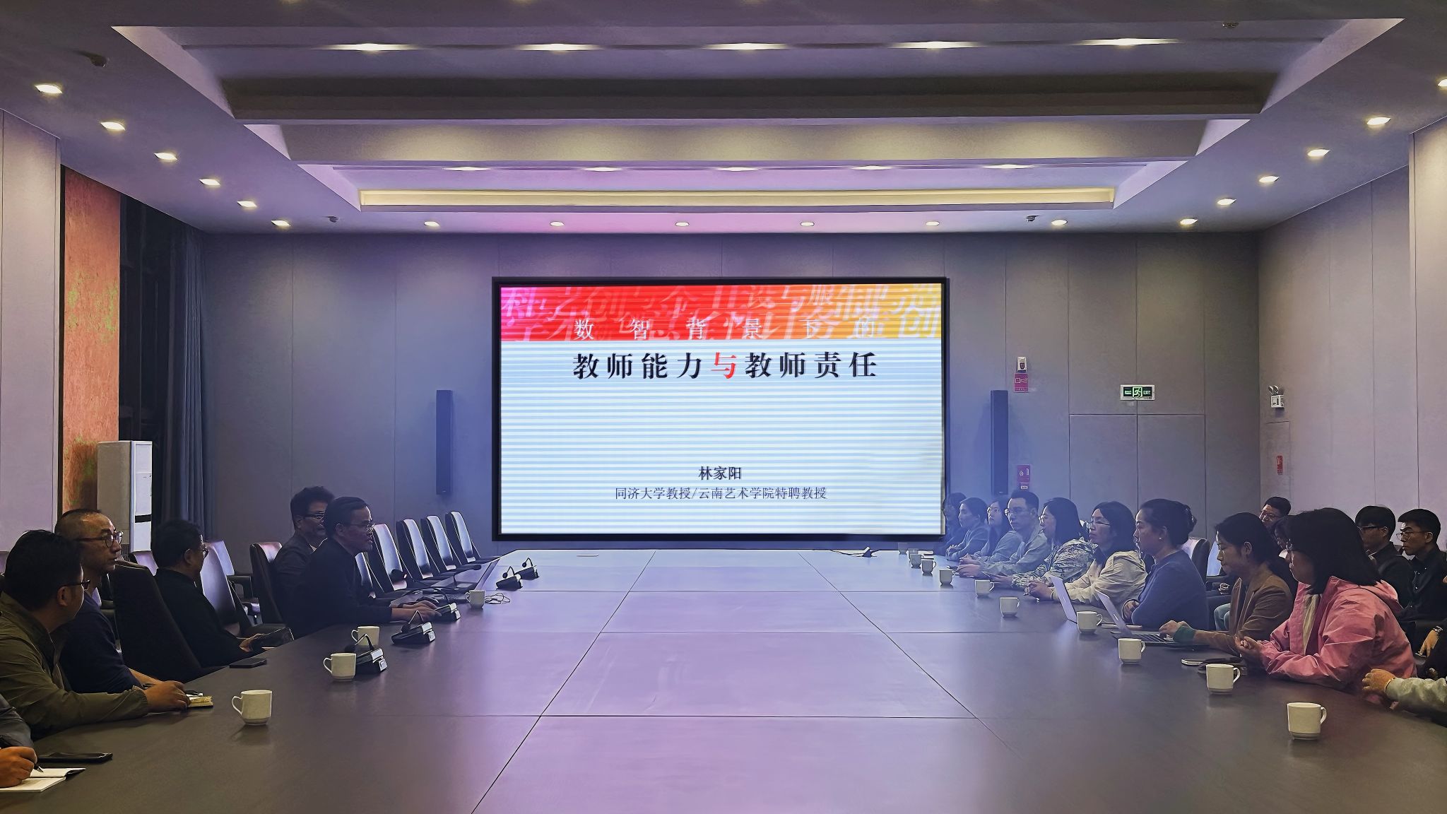 2025年9月29日晚,同济大学教授,云南艺术学院特聘教授林家阳教授为云南艺术学院今年刚入职的40余名新教师带来了一场关于教师职业发展与规划的讲座。本次讲座由云南艺术学院副院长陈劲松教授主持,出席讲座的嘉宾还有设计学院院长万凡教授、设计学院副院长邹洲教授。