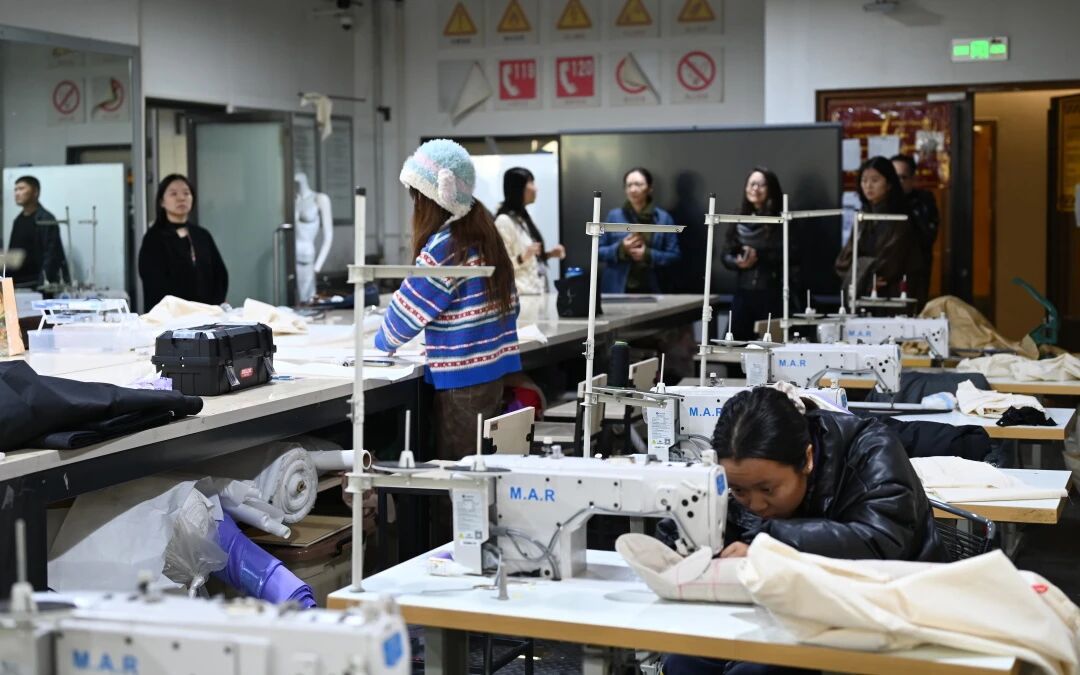 11 月 4 日下午,调研团队前往北京服装学院新校区,在王羿教授的陪同下参观了服装与服饰设计专业本科教学区域,包括本科学生优秀服装设计作品展,以及数字服装与智能设计实验室、数字机房、创意服装结构及立裁实验室、打板实验室、梭织实验室、针织实验室、特种工艺实训室等教学场地。