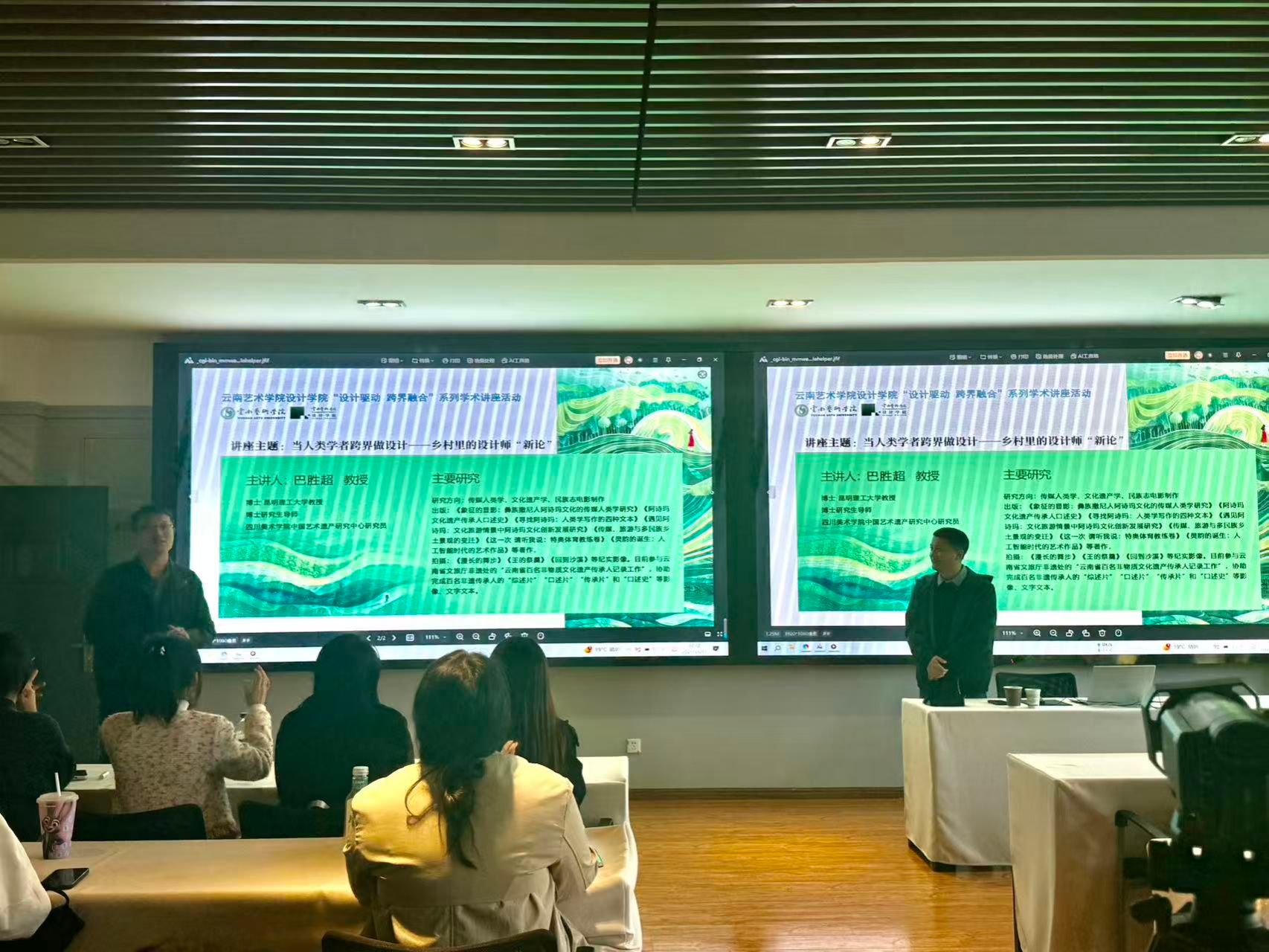 2025年11月17日,紧扣“设计驱动 跨界融合”系列学术讲座规划,结合设计学院“一站式”学生社区建设工作,专题讲座《当人类学者跨界做设计——乡村里的设计师“新论”》在设计学院202教室顺利举行。本次讲座特别邀请人类学博士、昆明理工大学艺术与传媒学院博士研究生导师巴胜超教授担任主讲人,设计学院研究生与科研管理科副科长杨艾伦主持活动,学院师生代表齐聚一堂,共同探讨跨界融合为乡村发展注入的新活力与新路径。