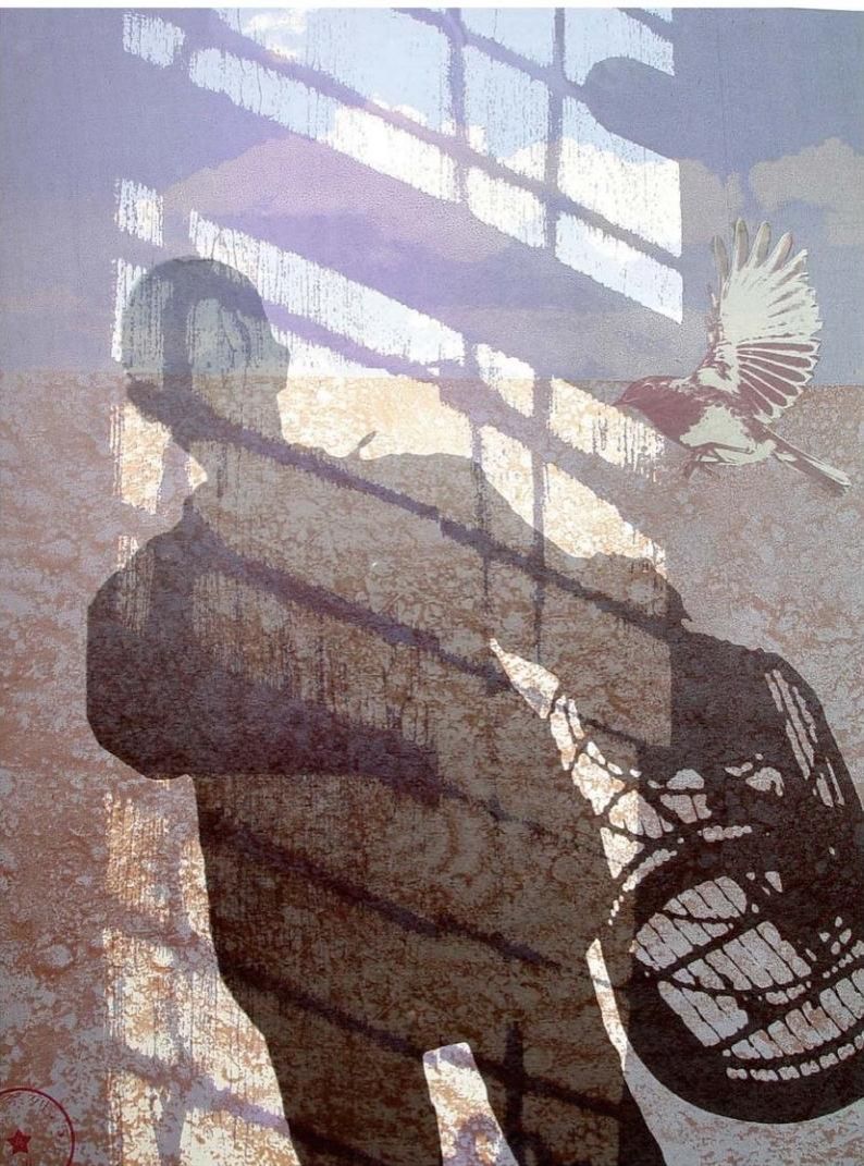 《网格外的一只鸟》丝网版画 72cmX67cm 2016年