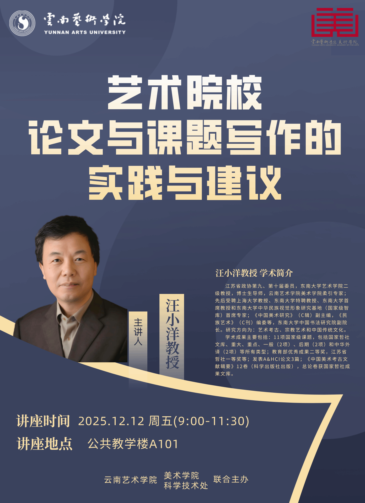 2025年12月12日上午9:00-11:30,由云南艺术学院美术学院、科技处联合主办的学术讲座“艺术院校论文与课题写作的实践与建议”在公共教学楼A101顺利举行。