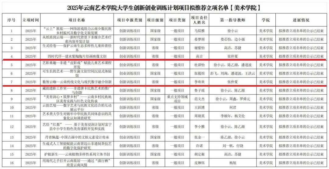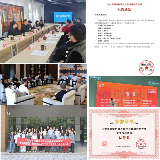 三、在创新人才培养方面,立足云南民族美术资源的开发与利用,积极探索数字化前沿与应用领域,持续增强创新应用研究与实践力度,积极建立行业企业合作发展平台,以聘任行业导师与产业导师+“双师双能型”教师培养及学生就业能力提升项目、政校企交流合作的形式,推动市场导向的产业融合,构建教创研用四位一体的人才培养模式。云南艺术学院美术学院党委书记刘恩权率雕塑专业师生赴建水开展访企拓岗与对外交流工作,进一步为提升产教融合与校企合作质量提出建设思路与改进举措。聘任“建水紫陶四老”为代表的国家级、省级非物质文化遗产代表性传承人、紫陶名家为美术学院雕塑专业行业导师、客座教授、产业导师,加强双师型队伍建设,以双师共建薪火相承非遗技艺,使学院成为连接传统技艺与当代创新发展的人才培养与创新基地。依托云南省高校数字化艺术创作重点实验室开设《“双师双能型”教师培养及学生就业技能提升项目》,加强“双师双能型”教师培养,培训教师7人、本科生14人、研究生4人,在美术学院公众号上连续发布8期《AI+数字造型+3D打印课程》学习报告,以在地性项目制、生态文明创作成果产出为导向的形式,提高师生人工智能与创新创业能力。2020级毕业生雕塑作品入选《2025届全国高校毕业生优秀雕塑作品展》7件,其中《布朗族系列》雕塑作品荣获铜奖。在校本科生立项省级大学生创新创业训练项目2项、荣获大学生创新校赛铜奖2项、入选国家级省级展览8项,在校研究生入选国家级省级展览52项。荣获优秀指导教师3项。教师雕塑作品入选国家级、省级、校级展览20项。开设微专业课程《AI雕塑设计》。申报教育部高等学校科学研究发展中心产学研创新基金项目《智绘陶·生成式AI赋能陶瓷创新人才培养模式探索与实践》。