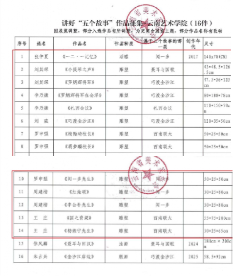一、在专业课程教学方面,以思政元素与艺术创作融合路径铸牢中华民族共同体意识教育实践价值。通过教学与创作弘扬社会主义核心价值观、中华优秀传统文化、革命文化等思政元素的育人功能,形成专业知识与技能、教育与产出相结合的综合教育教学模式。在云南省美术家协会主办的云南讲好“五个故事”美术书法作品展作品征集中,云南艺术学院入选16件美术作品中14件为雕塑专业作品,充分彰显雕塑专业在云南主题雕塑创作中的创作实力与引领。在美术学院庆祝第41个教师节暨课程思政建设师生雕塑作品展中展出作品50件, 持续推动课程思政育人模式改革。