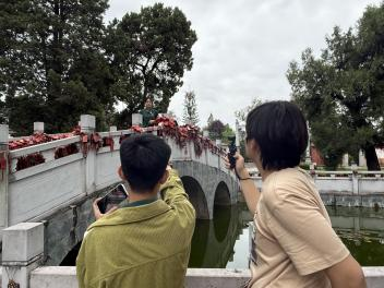 30日,张露月老师带领推普服务队,开展文化宣传行动。推普服务队分成三个小组,依托播音与主持专业特色,以短视频为创新载体:聚焦巍山“一根面”非遗传承传播,用标准普通话解说揉面、拉面、甩面等工艺细节,让语言示范与非遗技艺完美结合;走进巍山文庙,以播音叙事节奏讲解文庙建筑规制,传承儒家文化,尽显播音艺术的表达功底;走进巍山博物馆,用标准生动的普通话讲述文物背后的历史故事。队员们专业出镜,将知识性与语言示范性深度融合,既推广了普通话,又让巍山特色文化得以鲜活传播,实现了语言赋能与文化传播的交相辉映。
