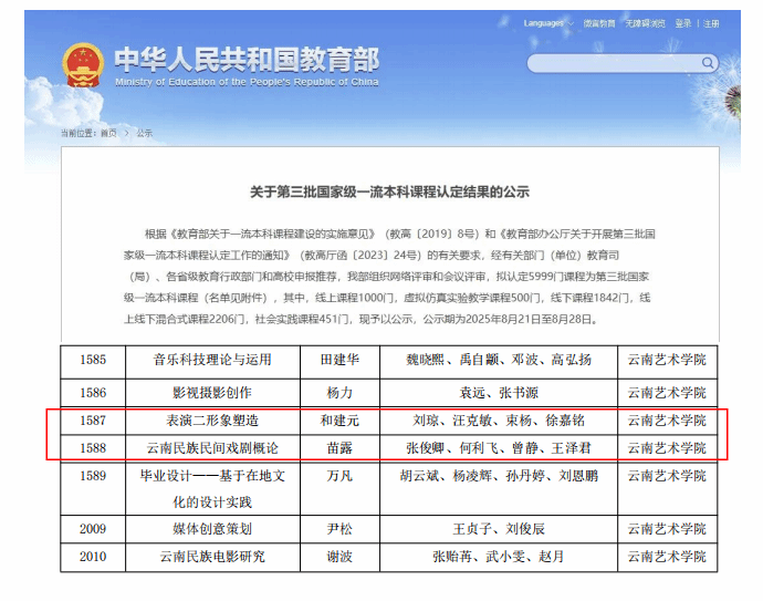 近日,教育部公布了第三批国家级一流本科课程认定结果,云南艺术学院共获批7门,其中5门课程属于戏剧与影视学科类。戏剧学院苗露教授领衔的《云南民族民间戏剧概论》,和建元教授领衔的《表演二形象塑造》2门课程同获国家级线下一流课程。
