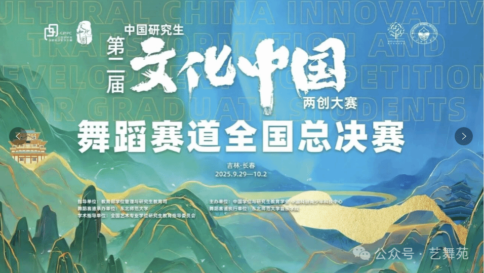 由教育部学位管理与研究生教育司指导,中国学位与研究生教育学会和中国科协青少年科技中心联合主办,东北师范大学承办,全国艺术专业学位研究生教育指导委员会担任学术指导的第二届中国研究生“文化中国”两创大赛(舞蹈赛道)全国总决赛,于9月29日至10月2日在东北师范大学举行。全国共有44个舞蹈创作组作品、37个舞蹈表演组作品和36堂舞蹈教育课程入围此次全国总决赛。
